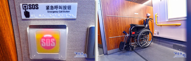 全列覆蓋免費(fèi)高速Wi-Fi,旅客在旅行途中可以隨時(shí)使用電腦辦公、手機(jī)娛樂。車廂內(nèi)設(shè)有大件行李存放處、無障礙衛(wèi)生間等設(shè)施,并在殘疾人座位區(qū)配備輪椅固定裝置、SOS按鈕等。