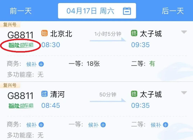 △在12306上購買京張高鐵車票時(shí),該車型車次下方會有綠色“智能動車組”字樣