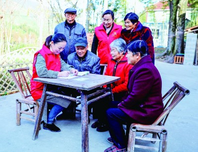 浙江長興縣和平鎮(zhèn)方家莊村便民服務(wù)中心志愿者為村里老人上門辦理第三代社保卡換證業(yè)務(wù)。新華社發(fā)