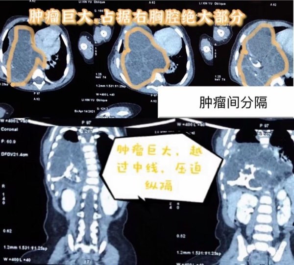 一周前,小彤彤因為氣喘、呼吸困難、惡心在當?shù)蒯t(yī)院就診,胸片檢查提示隔膨升可能,為了明確診斷來到哈爾濱市兒童醫(yī)院心胸外科就診。戚家峰副主任為孩子進一步進行查體考慮是縱隔腫瘤,通過胸部CT增強造影檢查更加清晰的看到腫瘤的特殊性,該腫瘤幾乎占滿右側(cè)胸腔,縱隔被擠壓后導(dǎo)致移位,心臟、食管均有不同程度的受壓影響。而且這個巨大的腫瘤由很多分隔組成,分隔中含有的物質(zhì)又不同,有囊性組織、實性組織和鈣化組織,考慮畸胎瘤可能。
