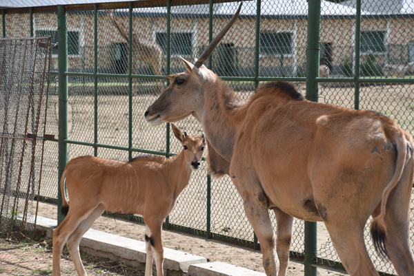 比起環(huán)尾狐猴媽媽的悉心照料,四月份在非洲草食動物散放區(qū)新出生的雄性小羚羊就很令人擔(dān)心,因?yàn)槟懶〉男率謰寢尣粫樟虾⒆樱运蛔屪约彝藿?,不給娃吃奶。飼養(yǎng)員看到這種情況采取了人工輔助的辦法,把奶擠出來讓小羚羊吃到初乳。雖然媽媽一直躲著自己,但是小羚羊堅(jiān)持要“親力親為”吃奶。飼養(yǎng)員就拿食物在前面引誘羚羊媽媽,讓它站立安穩(wěn)點(diǎn),時間長一點(diǎn),小羚羊慢慢靠近就可以吃到母乳啦!現(xiàn)在大羚羊媽媽已經(jīng)完全能接受這個小家伙了,常常依偎在一起。解決了小羚羊的吃飯問題后,小家伙就開始茁壯成長,一天比一天活波可愛。