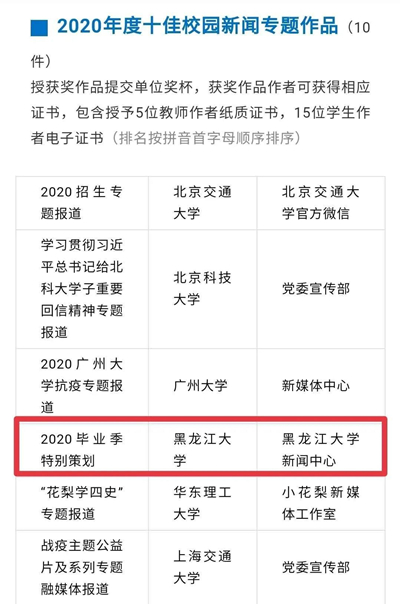 在2020年度全國百強(qiáng)校媒融合新聞專題評比中,黑龍江大學(xué)報(bào)送的《黑大2020畢業(yè)季特別策劃》憑借豐富的表現(xiàn)形式、多元新穎的報(bào)道主題和呈現(xiàn)角度、清晰合理的編排結(jié)構(gòu)、強(qiáng)可讀性等綜合指標(biāo),經(jīng)過初審、復(fù)審、終審各環(huán)節(jié),獲評“2020年度十佳校園新聞專題作品”。