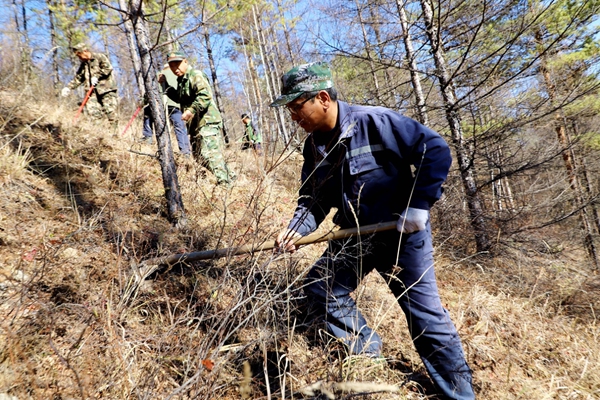 圖為阿木爾林業(yè)局黨員干部職工在綠林林場(chǎng)的適宜山坡種植黃芪。王力 攝
