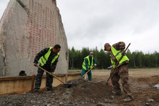 阿木爾林業(yè)局環(huán)衛(wèi)隊(duì)黨員干部職工為林業(yè)局在西出口路新建的地標(biāo)打地基(王力 攝)