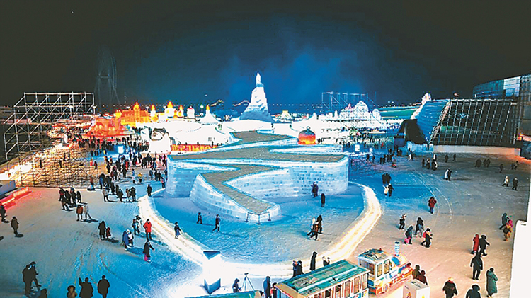 哈爾濱冰雪大世界“冬夢飛揚”以北京冬奧會會徽“冬夢”為靈感來源。