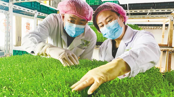 楊帆夫婦在查看芽苗菜長勢。 姜立偉 攝