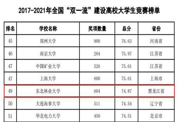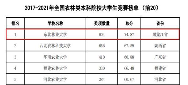 黑龍江經(jīng)濟(jì)網(wǎng)訊(黑龍江日?qǐng)?bào)全媒體見(jiàn)習(xí)記者董廣碩 商祺)近日,中國(guó)高等教育學(xué)會(huì)高校競(jìng)賽評(píng)估與管理體系研究工作組發(fā)布2021全國(guó)普通高校大學(xué)生競(jìng)賽分析報(bào)告,在《2017-2021年農(nóng)林類(lèi)本科院校大學(xué)生競(jìng)賽排行榜TOP20》中。東北林業(yè)大學(xué)以總分74.87(獲獎(jiǎng)604項(xiàng))的優(yōu)異成績(jī)連續(xù)四年蟬聯(lián)榜首。