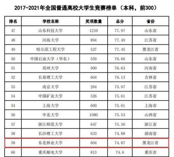 據(jù)悉,中國(guó)高等教育學(xué)會(huì)自2017年2月啟動(dòng)《高校競(jìng)賽評(píng)估與管理體系研究》項(xiàng)目以來(lái),中國(guó)高等教育學(xué)會(huì)已經(jīng)連續(xù)發(fā)布六輪榜單,這是我國(guó)第一個(gè)專(zhuān)注高校創(chuàng)新人才培養(yǎng)暨學(xué)科競(jìng)賽成果的排行榜,是檢驗(yàn)高校人才培養(yǎng)質(zhì)量的重要途徑。為從更長(zhǎng)的時(shí)間段了解各高校大學(xué)生競(jìng)賽發(fā)展態(tài)勢(shì),特在今年發(fā)布了“六輪總榜單”,時(shí)間跨度從2012年到2021年,東北林業(yè)大學(xué)以總分73.42,位列全國(guó)第63位。