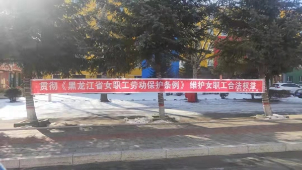 在主要街道懸掛“貫徹《黑龍江省女職工勞動保護條例》 維護女職工合法權益”宣傳條幅,提示廣大職工知曉《黑龍江省女職工勞動保護條例》,提醒、督促各單位認真貫徹執(zhí)行條例,維護女職工合法權益。