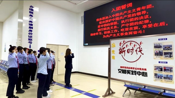重溫入團誓詞,匯聚青春力量。為進一步引導廣大團員青年厚植愛國、愛黨、愛稅收事業(yè)的深厚情感,進一步增強團支部的組織力量,安達市稅務(wù)局團支部開展重溫入團誓詞活動,在莊嚴的團歌聲中,11名安達市稅務(wù)局奮戰(zhàn)在稅收一線的團員干部在團支部書記的帶領(lǐng)下,面向誓詞莊嚴宣誓。宣誓完畢后,安達稅務(wù)青年紛紛表示,將立足本職、埋頭苦干,用一流的業(yè)務(wù)能力為納稅人繳費人帶來一流的納稅服務(wù)體驗,為安達稅收事業(yè)奉獻青春力量。