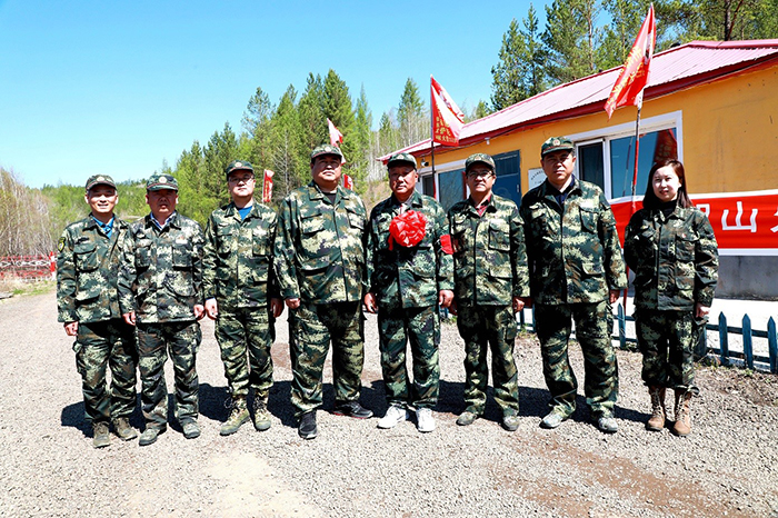 阿木爾林業(yè)局、依東林場領(lǐng)導(dǎo)干部與即將退休的共產(chǎn)黨員、管護員滿德江合影。(王力 攝)