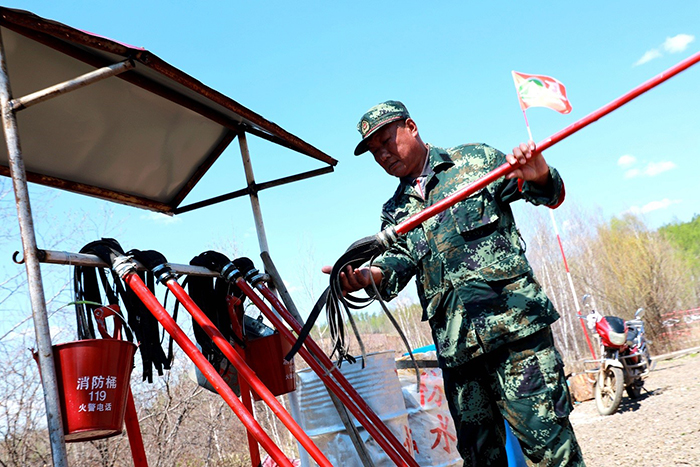 共產(chǎn)黨員、管護員滿德江帶著依依不舍,再次整理、擺放撲火工具。(王力 攝)