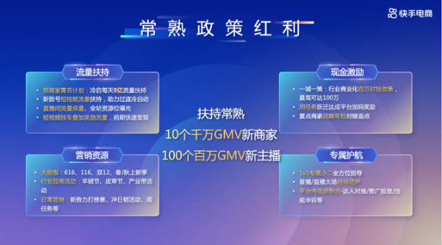 在流量扶持方面,新手常熟商家可享受“青云計劃”每天8億流量扶持,還有短視頻流量扶持、直播間流量保量、全站資源位曝光、短視頻掛車疊加獎勵等;在營銷資源方面,快手電商打造每月高頻的營銷場景,包括大促、節(jié)日、行業(yè)品類活動、寵粉節(jié)等,并為常熟商家提供活動補(bǔ)貼,激活品牌動銷;此外還有最高價值100萬的商業(yè)化對投政策、周任務(wù)躍遷達(dá)成平臺加碼獎勵等現(xiàn)金激勵,以及1V1專屬小二全方位指導(dǎo)等專屬護(hù)航。
