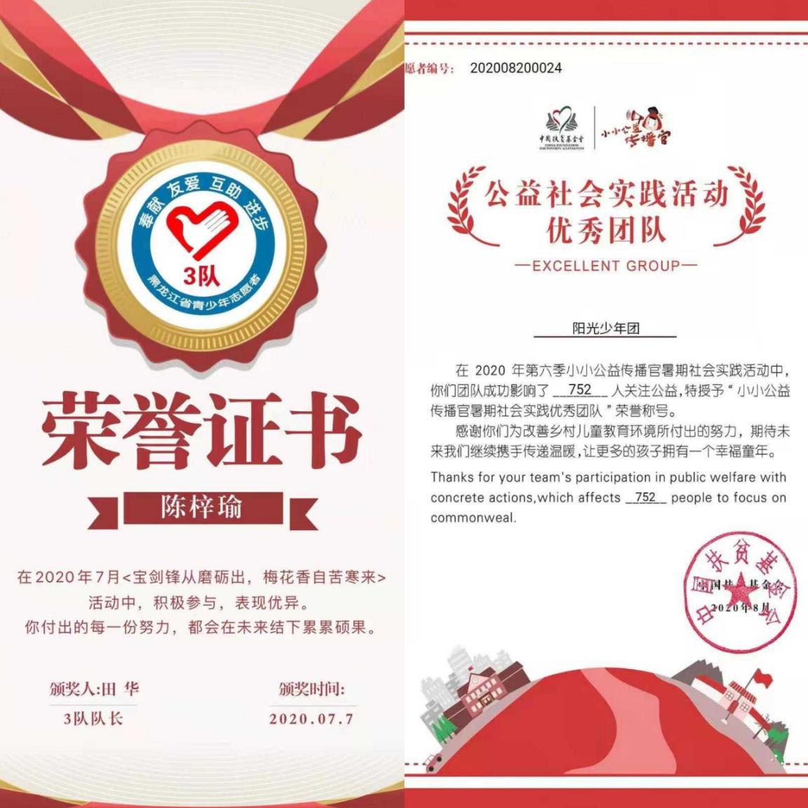 她在志愿服務(wù)中不怕苦不怕累,圓滿完成各項任務(wù),獲得各界一致好評,先后獲得省市(區(qū))的相關(guān)表彰,并被省幫扶中心授予“愛心少年”榮譽稱號。