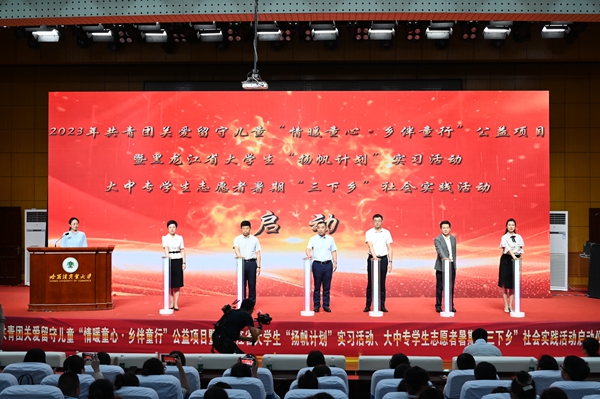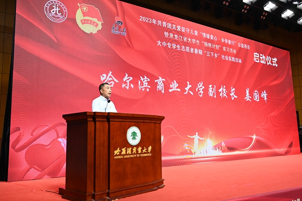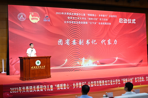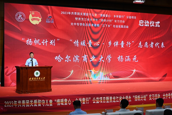 本次活動,在哈爾濱商業(yè)大學的大力支持下順利開展,哈爾濱商業(yè)大學副校長姜國鋒在儀式上致辭,他說:“學校建校71年來,立足立德樹人根本任務,聚焦‘為黨育人,為國育才’的職責使命,在不斷加強‘第一課堂’建設的同時,還依托學?!惑w兩翼’文化育人模式,充分發(fā)揮實踐育人的作用,通過開展‘三下鄉(xiāng)’‘返家鄉(xiāng)’等社會實踐和‘西部計劃’‘興邊富民’志愿服務項目,引導廣大青年學生堅持用習近平新時代中國特色社會主義思想凝心鑄魂,在社會的課堂中‘受教育、長才干、作貢獻’。”活動現(xiàn)場,播放《黑龍江省希望工程30年與光同行》和黑龍江省大中專學生志愿者暑期“三下鄉(xiāng)”社會實踐活動宣傳片,與會領導上臺共同啟動了“情暖童心·鄉(xiāng)伴童行”公益項目、大學生“揚帆計劃”實習活動、大中專學生志愿者暑期“三下鄉(xiāng)”社會實踐活動。