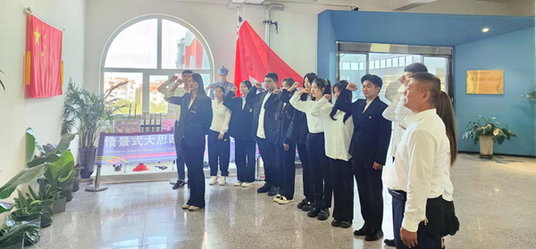 在課程結(jié)束之際,少先隊員發(fā)出了“勿忘國恥 吾輩自強”的錚錚誓言;黑龍江外國語學院藝術(shù)系輔導員張博雅帶領(lǐng)在場全體黨員重溫了入黨誓詞。短短的十二句話,道出了中國共產(chǎn)黨的百年奮斗歷程,凝聚著每一名黨員不忘初心、堅守理想的信念與力量。面對黨旗,全體黨員莊嚴地舉起右拳宣誓,表達了矢志不渝跟黨走的決心和勇?lián)姑⒉回擖h恩的堅定信念。