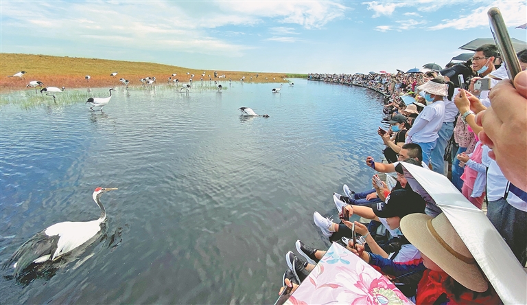 “五一”小長假期間,扎龍國家級自然保護(hù)區(qū)內(nèi)碧波蕩漾、水草豐盛,游客行走在濕地的棧道上,感受微風(fēng)清涼,在自然大氧吧里暢快呼吸,看丹頂鶴野化馴飛,與丹頂鶴近距離互動,人鳥共生自然和諧。