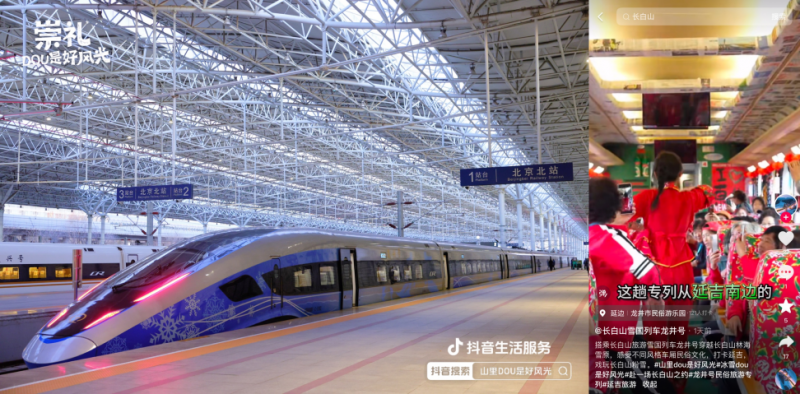 在線下,活動還聯(lián)動崇禮區(qū)政府、延邊州商務(wù)局、齊齊哈爾網(wǎng)信辦落地雪國專列,覆蓋復(fù)興號、民俗專列、高鐵站等不同場景,讓游客和市民感受濃濃冰雪氛圍,自發(fā)為當?shù)匚穆梅N草,吸引更多雪友來到小城看見好風光。截至活動收官,“開往崇禮站的雪國專列”熱度達827萬,一度登上抖音河北多地同城榜TOP1。