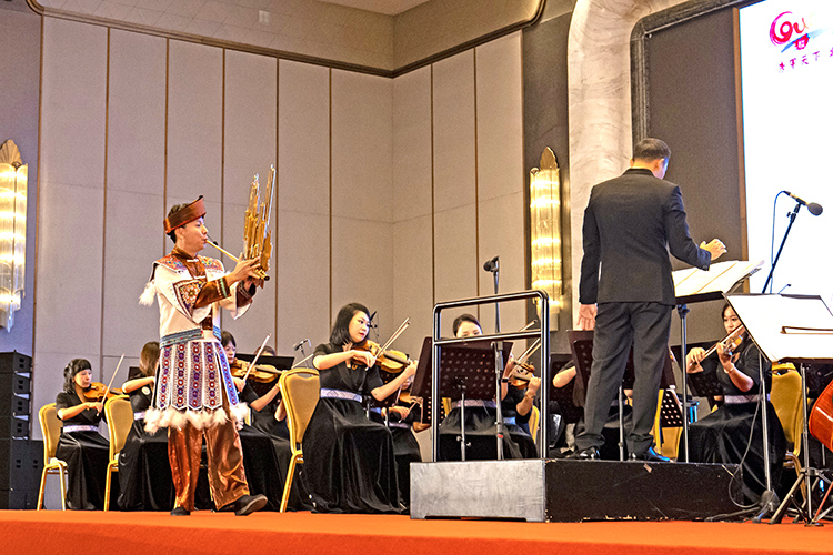 推介會在交響幻想曲《歌仙·劉三姐》中拉開帷幕,用美妙的音樂將現(xiàn)場觀眾帶到了壯鄉(xiāng)山水間。蘆笙與樂隊《節(jié)日的邊寨》、歌曲《廣西尼的呀》《連心歌》等極具廣西民族風情的旋律,將廣西各族兒女團結(jié)奮進的精神風貌娓娓道來。