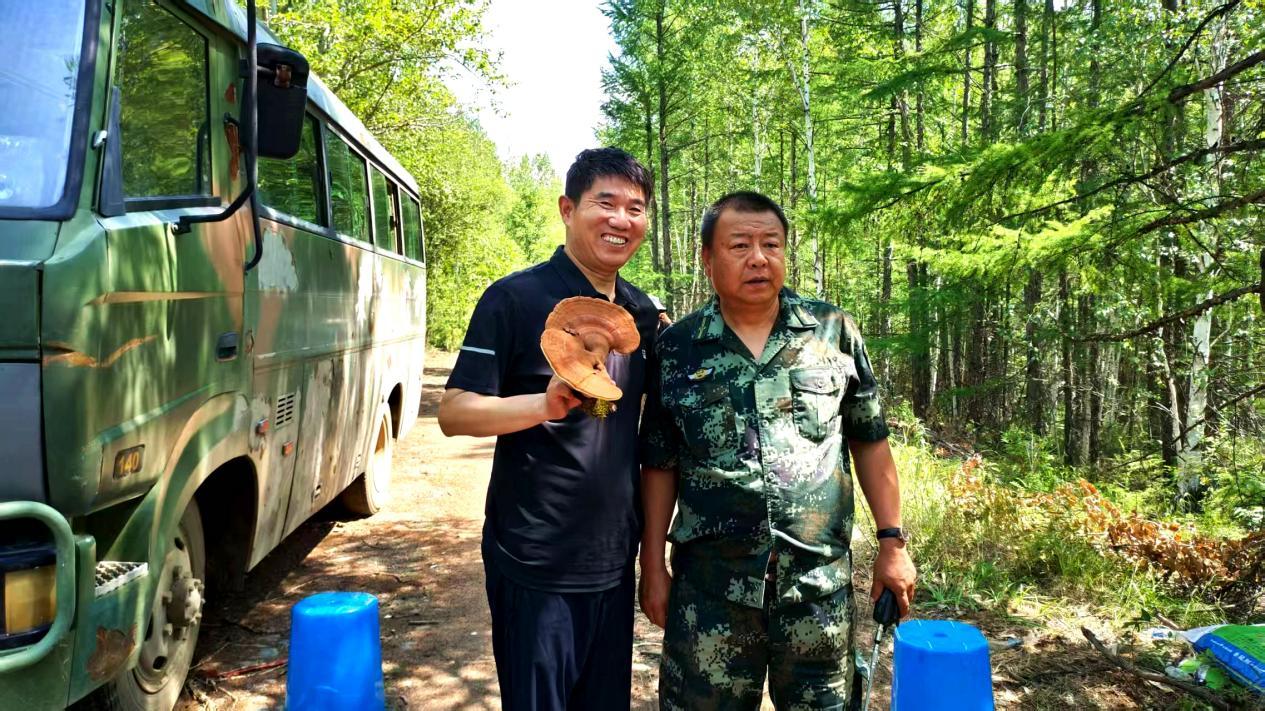 阿木爾林業(yè)局依西林場(chǎng)場(chǎng)級(jí)林長、場(chǎng)長朱世星(右)采摘野生靈芝(王力 攝)