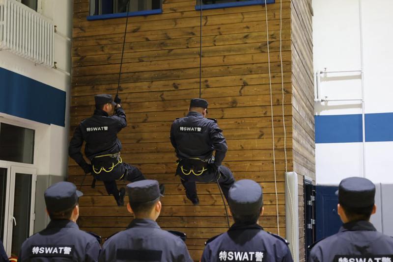 嚴(yán)苛訓(xùn)練礪精兵,汗水鑄就戰(zhàn)斗力。在戰(zhàn)術(shù)訓(xùn)練現(xiàn)場(chǎng),隨著指揮員一聲令下,隊(duì)員們迅速結(jié)成戰(zhàn)斗小組,交替掩護(hù)、快速推進(jìn),動(dòng)作連貫流暢。在徒手防控科目中,隊(duì)員們反復(fù)練習(xí)擒敵拳、控制術(shù)等技能,每一個(gè)動(dòng)作都追求標(biāo)準(zhǔn)規(guī)范。此外,針對(duì)冬季邊境地區(qū)夜長晝短,反恐與巡特警大隊(duì)還專門開展夜間訓(xùn)練,隊(duì)員們?cè)谝归g環(huán)境中搭建臨時(shí)帳篷并展開夜間搜索,進(jìn)一步提升了夜間的應(yīng)急處突能力。