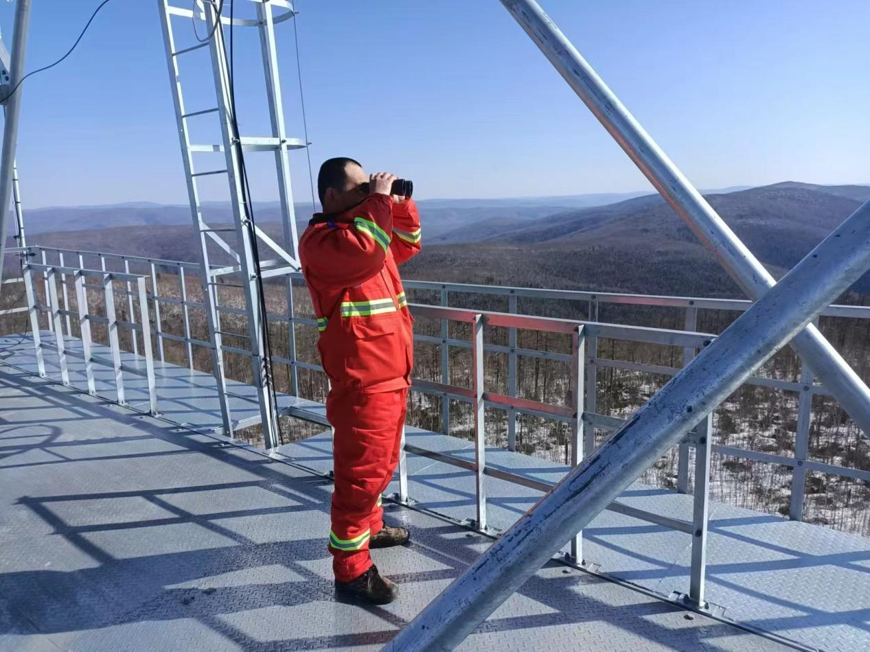 瞭望員在塔上進(jìn)行全天候火情巡查(艾泉 攝 )
