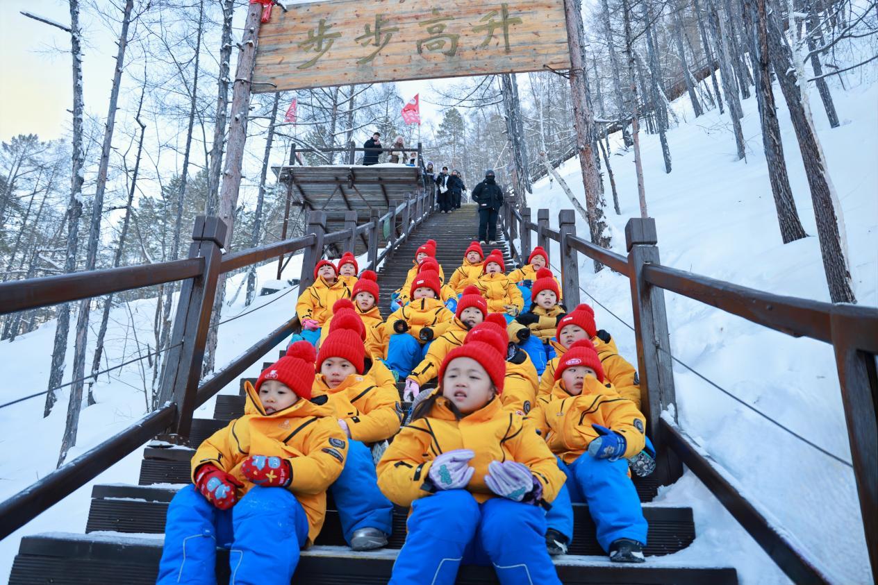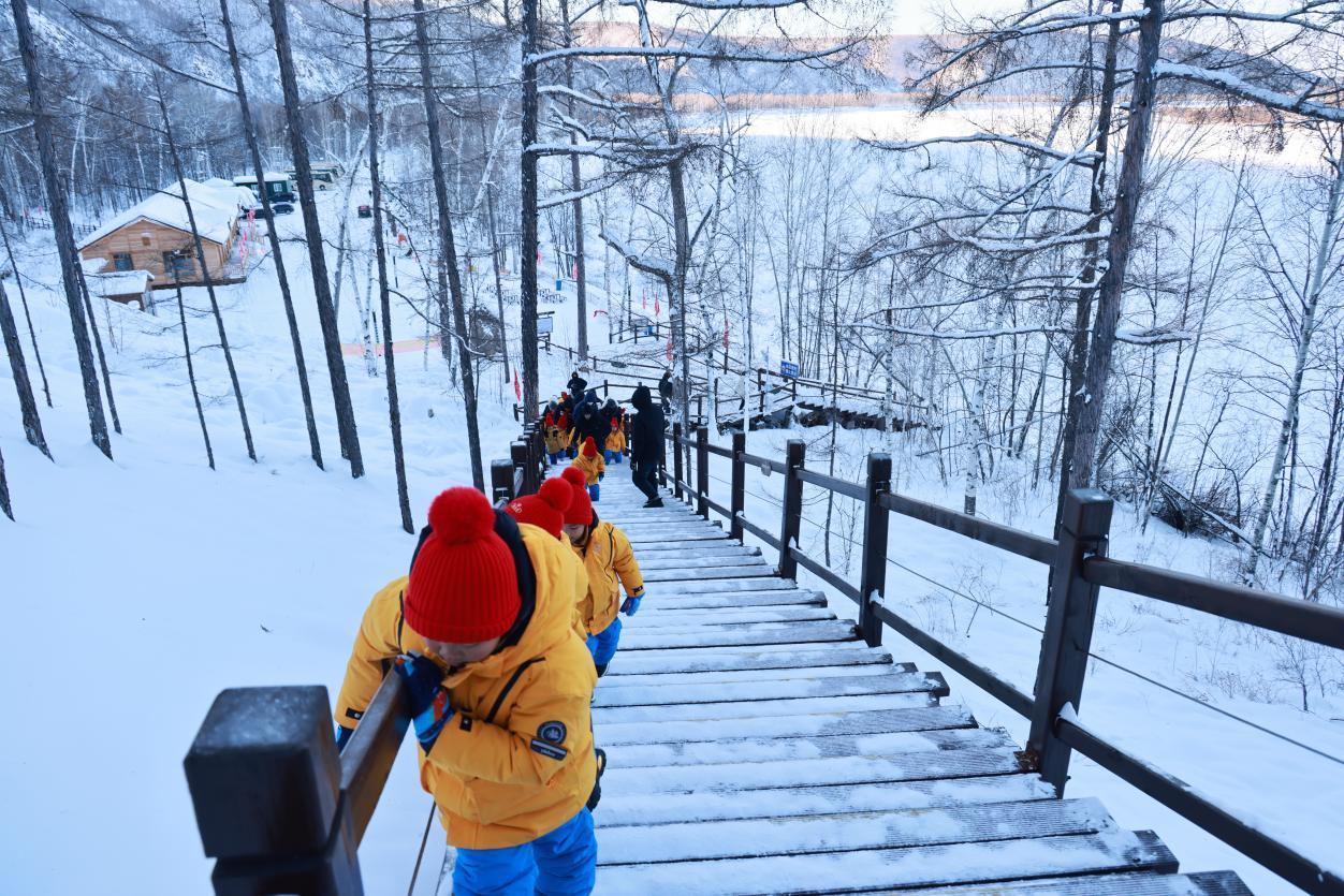 孩子們排成一串靈動的小隊,踩著積雪在棧道上噠噠前行,腳下“咯吱咯吱”的清脆聲響,為這場研學(xué)之旅奏響歡快序曲。軟糯的廣西口音此起彼伏,孩子們或好奇地觸摸棧道積雪,冰涼的觸感讓他們瞇起眼睛直跺腳;或緊緊抓著欄桿,任憑小臉凍得通紅,仍目不轉(zhuǎn)睛眺望遠(yuǎn)方“Ω”形的冰封江灣,沉浸式感受北國冰雪的奇妙。那一抹抹跳動的橘色,在純白世界中宛如一團(tuán)團(tuán)小火苗,格外耀眼。