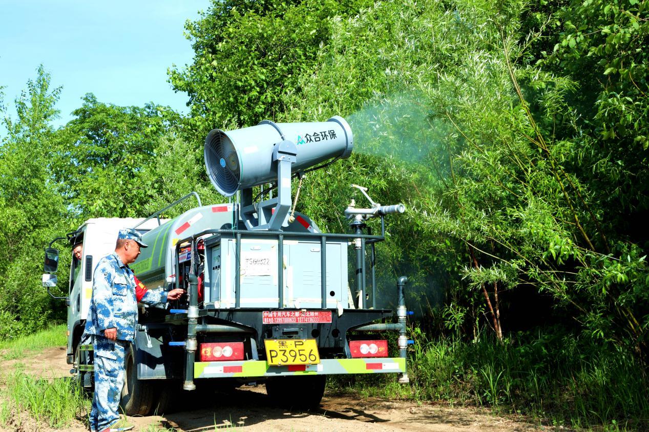 阿木爾林業(yè)局利用車載高射程噴霧機(jī),防治稠李巢蛾有害生物(王力 攝)