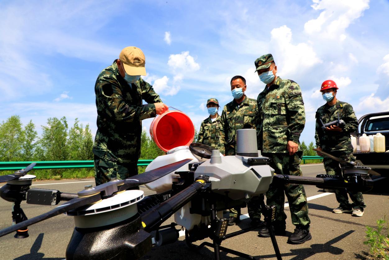 阿木爾林業(yè)局林防站工作人員為無(wú)人機(jī)添加防治藥液,防治樟子松梢斑螟(王力 攝)