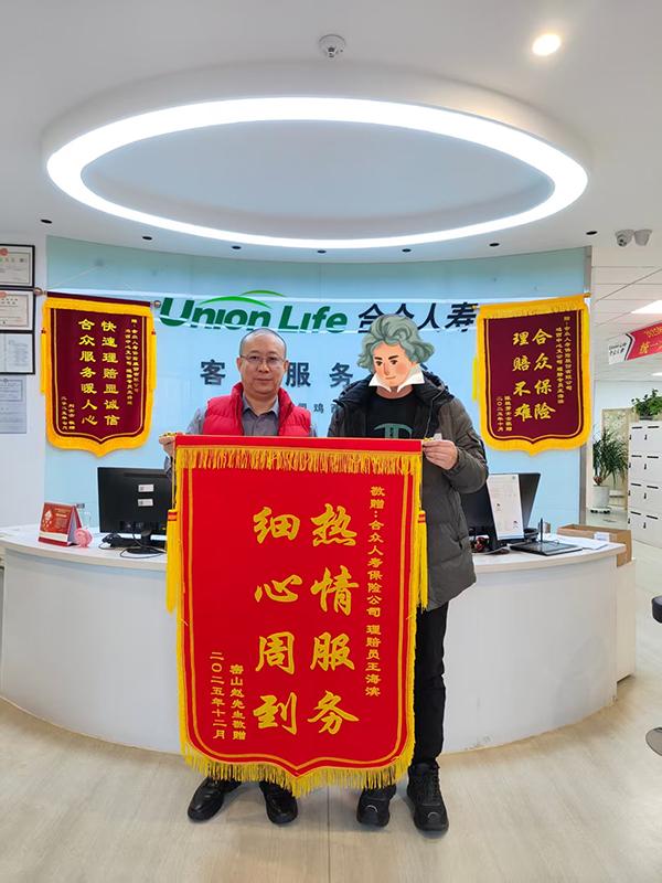 2026年1月5日,Z先生的兒子特意來(lái)到中支柜面,親手送來(lái)一面感謝的錦旗,書寫“熱情服務(wù) 細(xì)心周到”以此表達(dá)他們深深的謝意。錦旗上熠熠生輝的字句,不僅是對(duì)理賠人員專業(yè)服務(wù)的高度認(rèn)可,更是對(duì)合眾人壽溫暖關(guān)懷的由衷贊譽(yù),彰顯了合眾人壽在客戶心中樹(shù)立的良好形象以及雙方之間深厚的信任與情誼。