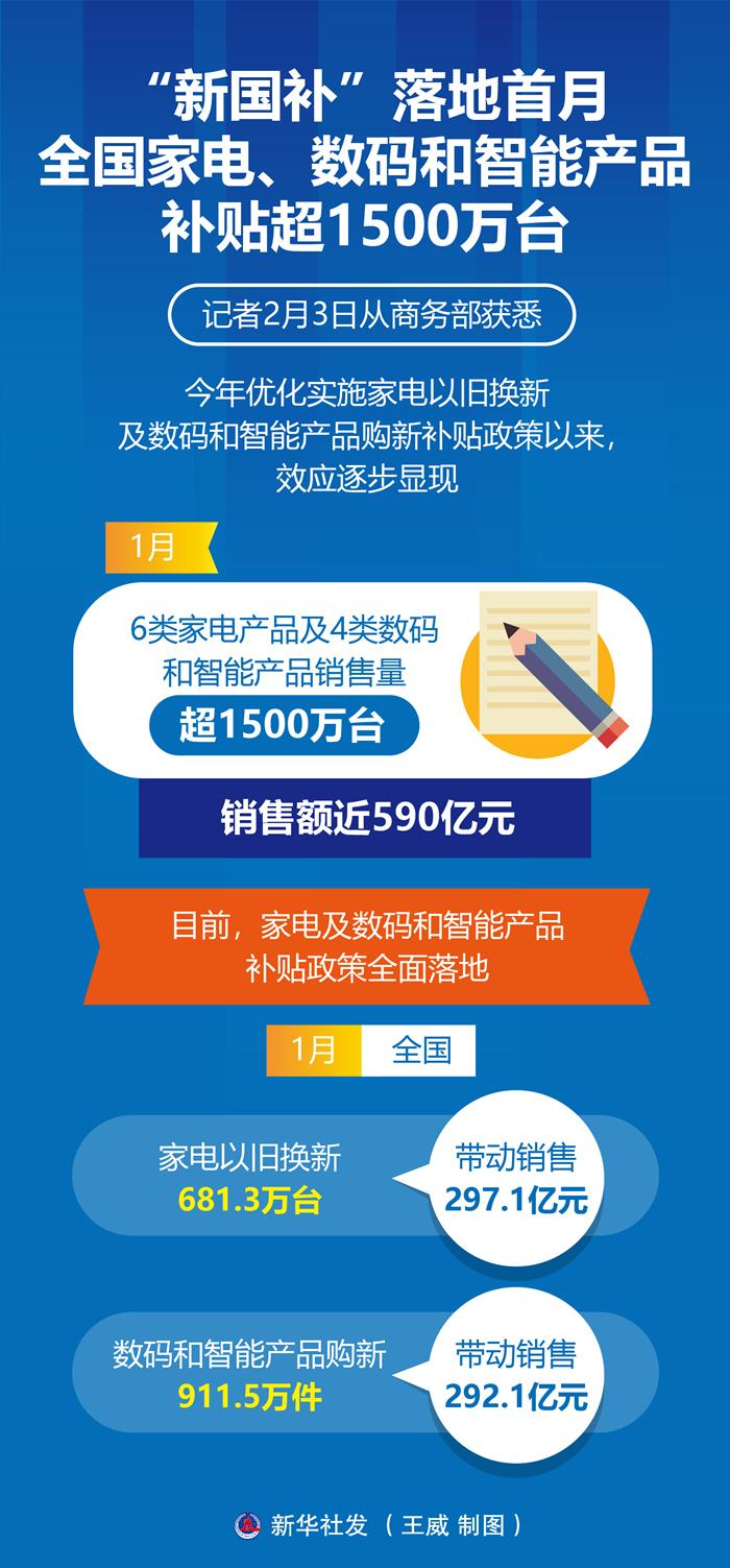 記者2月3日從商務(wù)部獲悉,今年優(yōu)化實(shí)施家電以舊換新及數(shù)碼和智能產(chǎn)品購(gòu)新補(bǔ)貼政策以來,效應(yīng)逐步顯現(xiàn)。1月,6類家電產(chǎn)品及4類數(shù)碼和智能產(chǎn)品銷售量超1500萬臺(tái),銷售額近590億元。