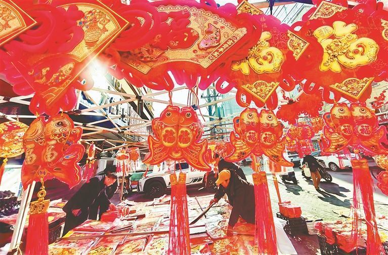 13日,哈爾濱市道外區(qū)大水晶街附近的集市上,許多市民在購買年貨。集市上,各種商品琳瑯滿目,應(yīng)有盡有。紅燈籠、“?!弊?、對聯(lián)烘托出濃濃的喜慶氣氛。人們臉上都洋溢著幸福的笑容,個(gè)個(gè)滿載而歸。